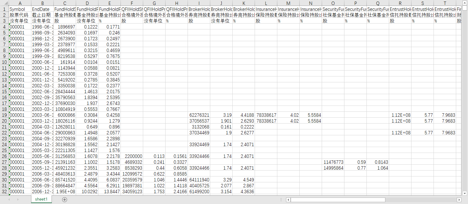 股票代码 截止日期 基金持股数量 基金持股比例(相对总股本) 基金持股比例(相对流通A股) 合格境外投资者持股数量 合格境外投资者持股比例(相对总股本) 合格境外投资者持股比例(相对流通A股) 券商持股数量 券商持股比例(相对总股本) 券商持股比例(相对流通A股) 保险持股数量 保险持股比例(相对总股本) 保险持股比例(相对流通A股) 社保基金持股数量 社保基金持股比例(相对总股本) 社保基金持股比例(相对流通A股) 信托持股数量 信托持股比例(相对总股本) 信托持股比例(相对流通A股) 财务公司持股数量 财务公司持股比例(相对总股本) 财务公司持股比例(相对流通A股) 银行持股数量 银行持股比例(相对总股本) 银行持股比例(相对流通A股) 非金融类上市公司持股数量 非金融类上市公司持股比例(相对总股本) 非金融类上市公司持股比例(相对流通A股) 其他机构持股数量 其他机构持股比例(相对总股本) 其他机构持股比例(相对流通A股) 机构投资者持股数量 机构投资者持股比例(相对总股本) 机构投资者持股比例(相对流通A股)