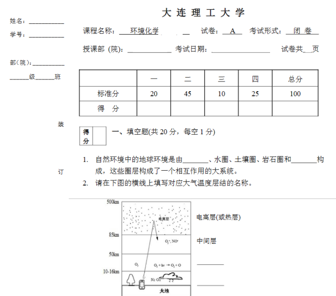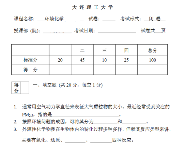 01大工大连理工大学环境化学及答案本科生期末试卷一套(即一年的)