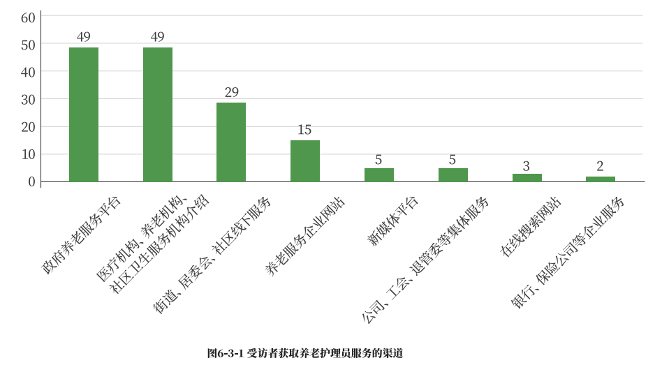 他们大多通过政府养老服务平台、医疗机构、养老机构和社区卫生服务机构等,获取护理员服务信息。其次是通过街道、居委会和社区线下服务渠道。