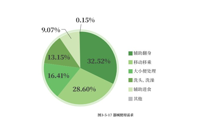 应用新技术、新产品辅助护理员工作,能够有效解决工作中的难题。调研数据显示,运用科技产品辅助翻身(32.52%)、辅助老人移动移乘(28.6%)、大小便处理(16.41%)是养老护理员使用科技产品最多的场景。