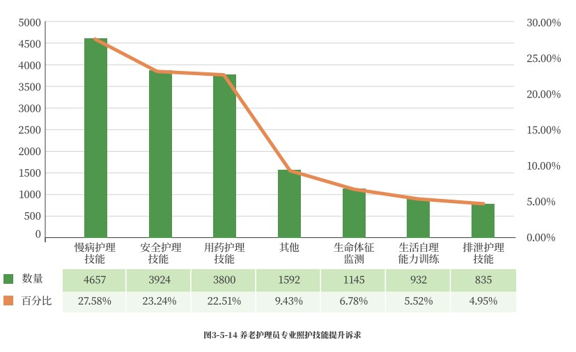 调查数据显示,27.58的养老护理员最想提升慢病护理技能,如对脑卒中、糖尿病用户的健康教育及基础护理;23.24%最想提升安全护理技能,如处理食、烫伤、摔倒等;22.51%最想提升用药护理技能,如协助用户遵医嘱口服、外用、管饲给药等。
