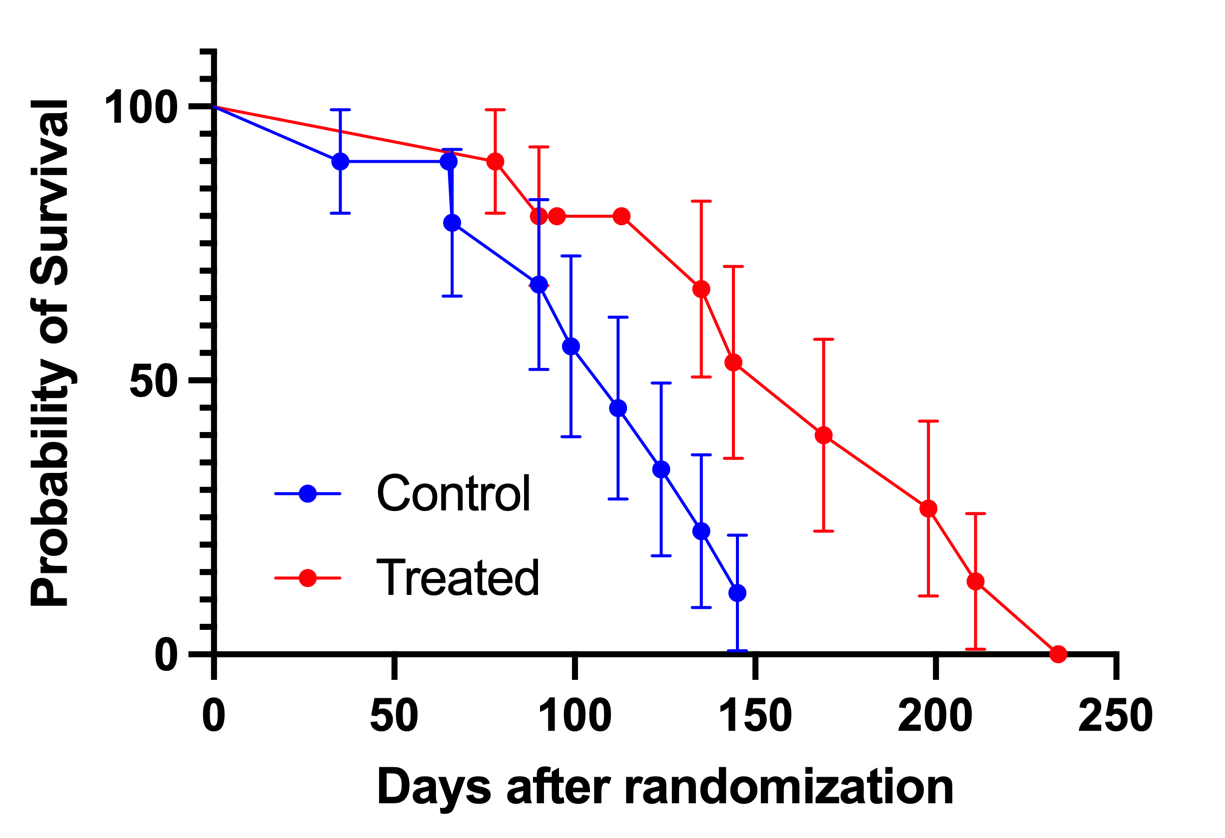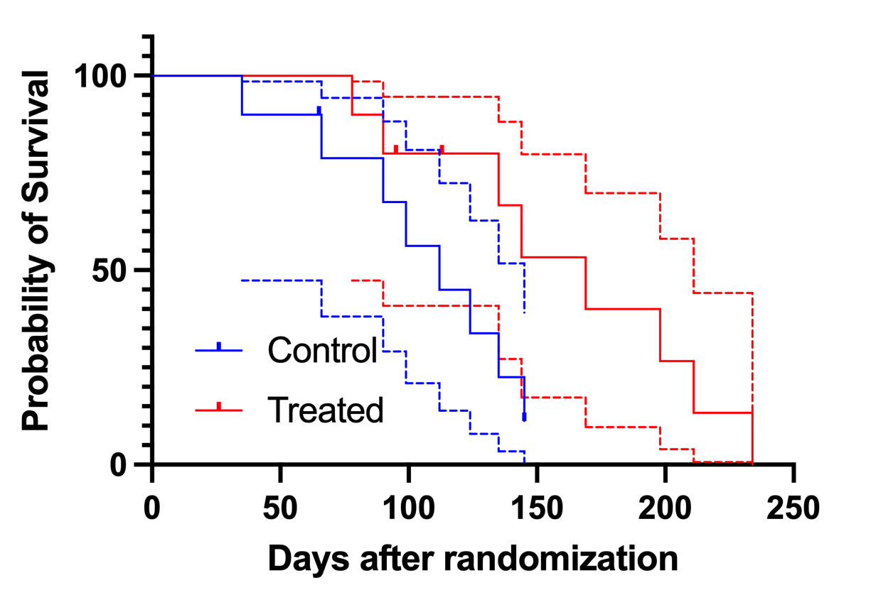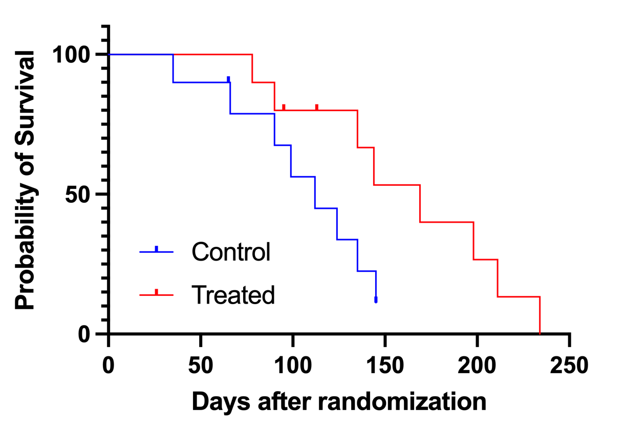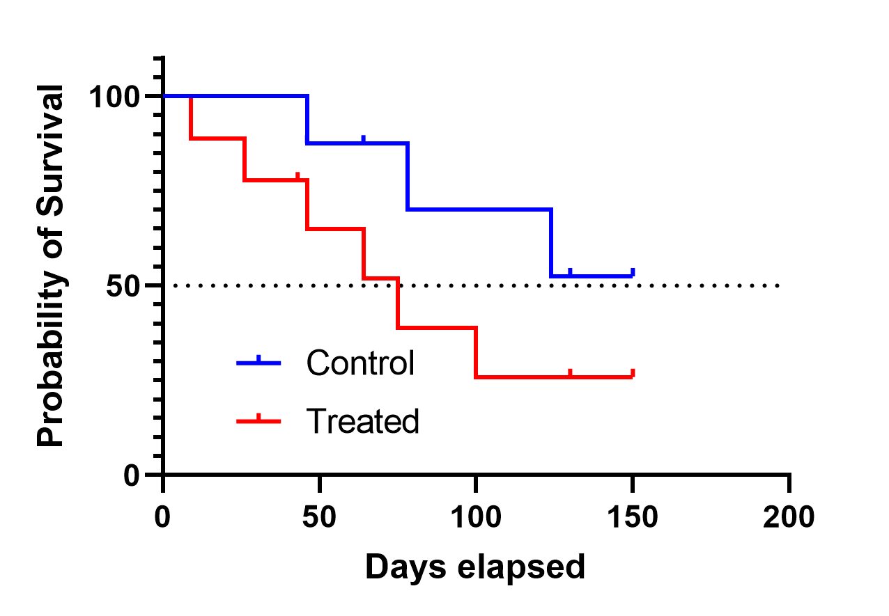 治疗组的中位生存时间为75天,而控制组的中位生存时间未定义(曲线未穿过50%生存概率线)。