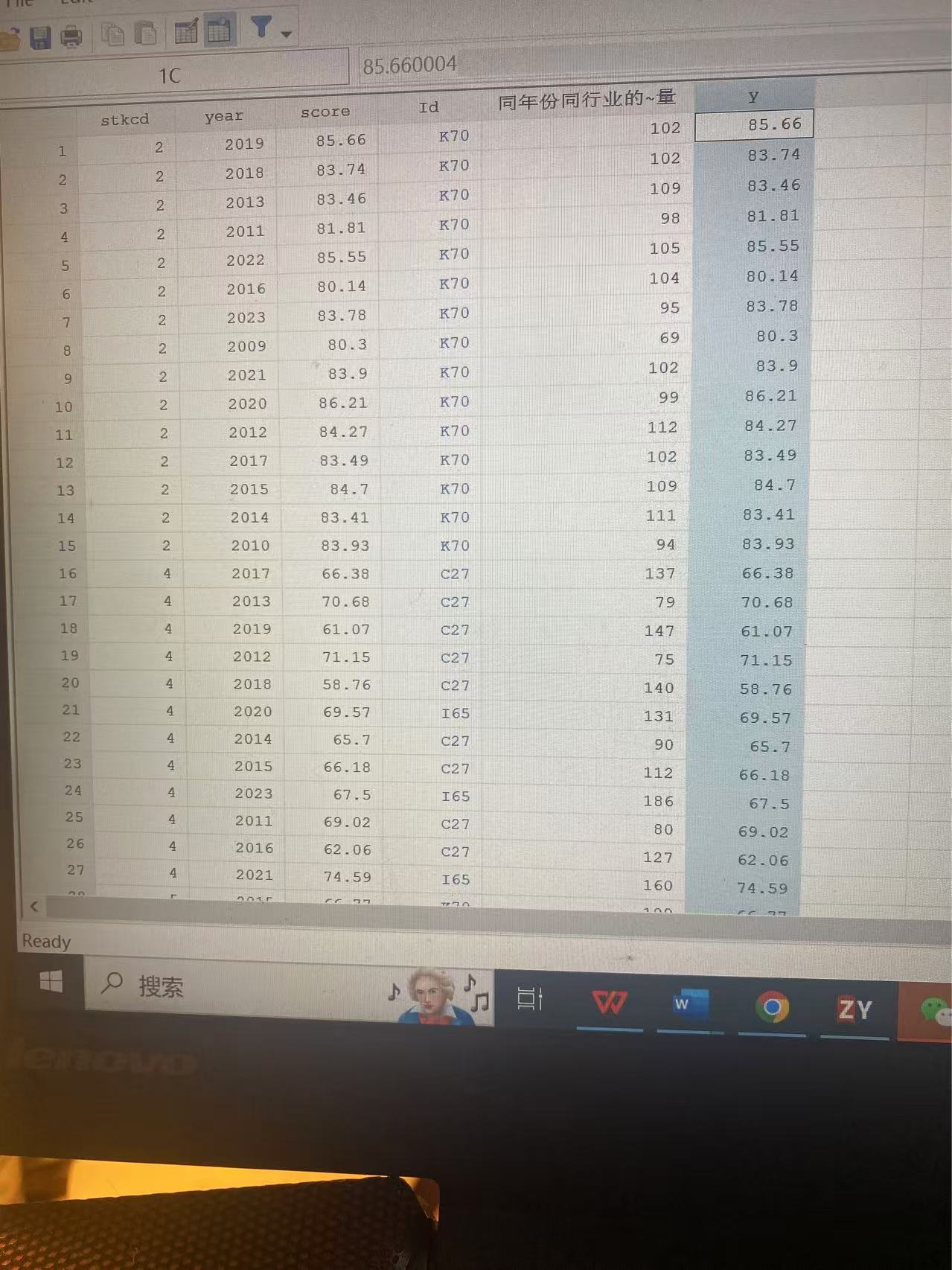 如图,想求变量y同行业同年份低于焦点企业的值之和,代码怎么写