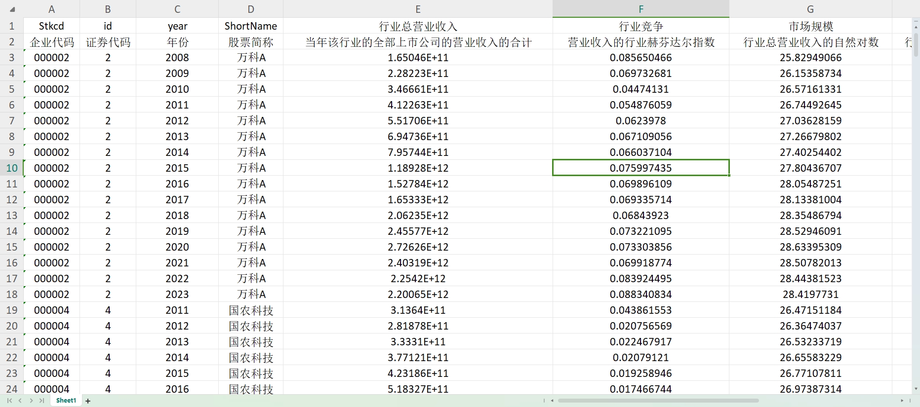 营业收入的行业赫芬达尔指数
