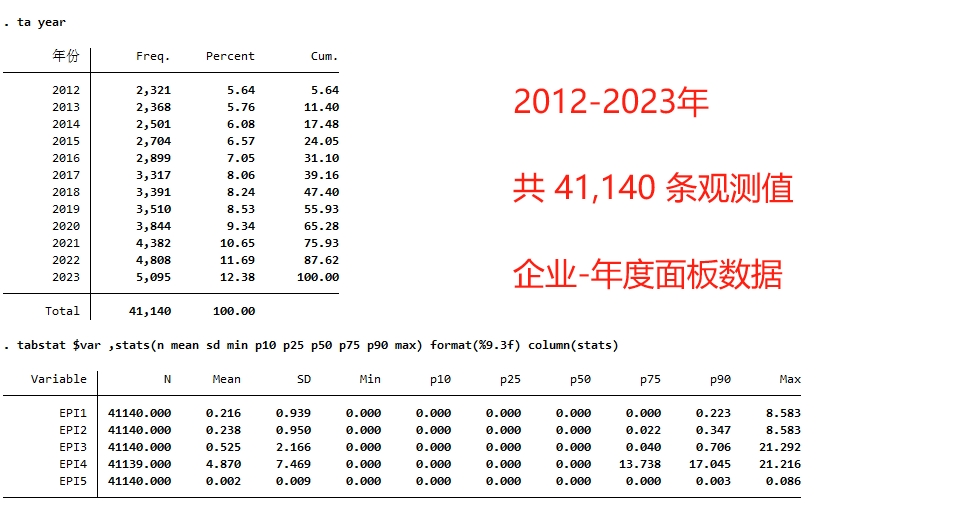 范围:2012 - 2023 年,共 41,140 条观测值,全部A股上市公司