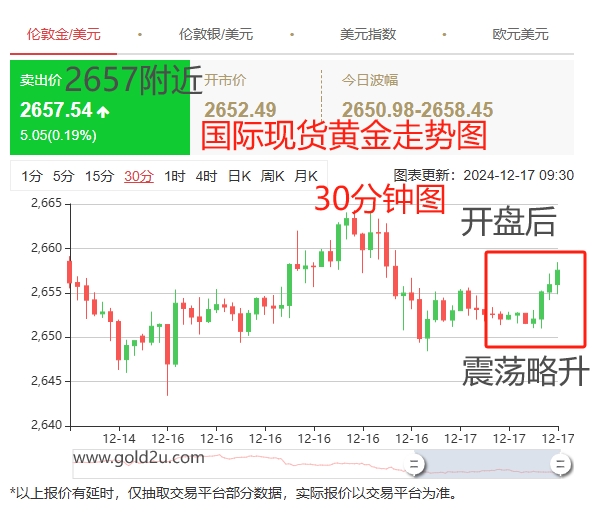 目前国际现货黄金金价在2657美元/盎司附近;上海黄金交易所报价617.67远/克。