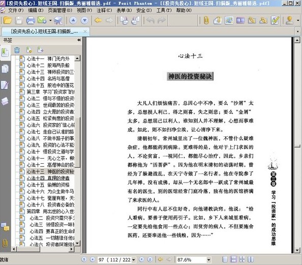 《投资先投心》关于如何做投资,我们一直寄希望向国外的巴菲特等大师学习,却忘了其实最好的智慧就在我们身边。炒股就是炒心,投资如同修禅。如今投资者太需要这样的人生模式,浮躁的社会也太需要这样的生活模式。《投资先投心》作者是一位投资名家,既深深理解投资者的烦恼,又享受投资之道的乐趣,他结合多年来的心得,把修禅与投资完美结合,不仅可以成为“中国式投资”智慧,也可以作为我们的成长忠告与幸福方案。只要你灵活变通地运用《投资先投心》的心法,改变投资思想,养成正确的投资习惯,就能逐渐改变投资的命运。