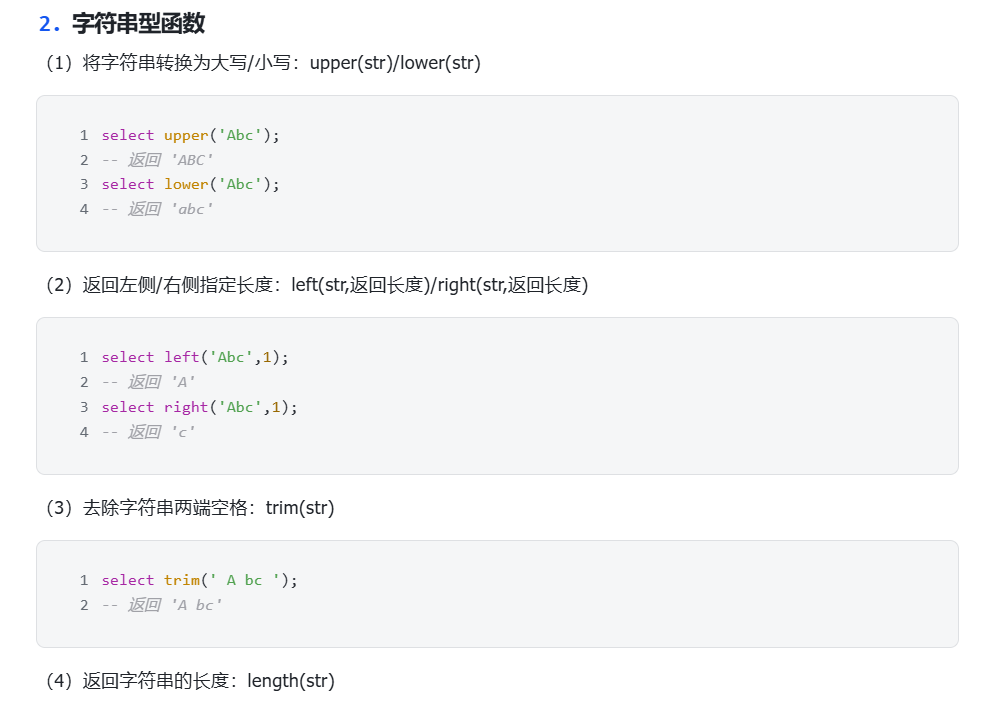 2. 字符串型函数:如CONCAT(连接字符串)、SUBSTRING(提取子串)、UPPER/LOWER(转换大小写)等。