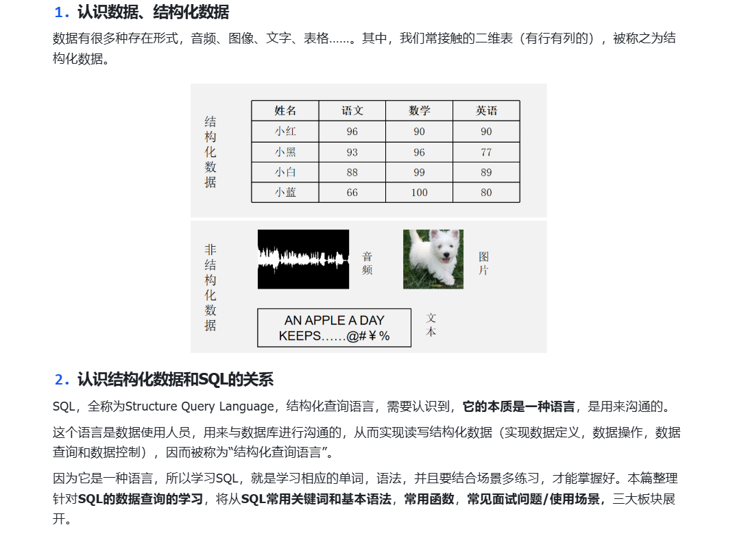 2. 认识结构化数据和SQL的关系:SQL是Structured Query Language的缩写,即结构化查询语言,是一种用于管理关系型数据库的标准编程语言。它可以帮助我们对结构化数据进行增加、删除、更新以及查询等操作。