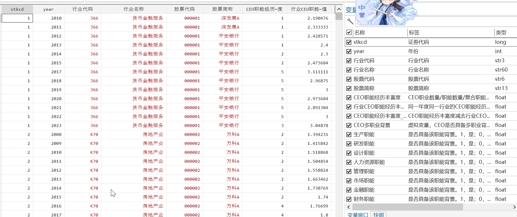 CEO多职业背景:虚拟变量,CEO是否具备多职业背景。1,是;0,否。(汤倩等2021,毛聚等2022)数据范围:全部A股上市公司。
