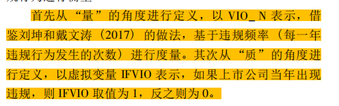 首先从“量”的角度进行定义,以VIO_N表示,借 鉴刘坤和戴文涛(2017)的做法,基于违规频率(每一年 违规行为发生的次数)进行度量。其次从“质”的角度进 行定义,以虚拟变量IFVIO表示,如果上市公司当年出现 违规,则IFVIO取值为1,反之则为0。