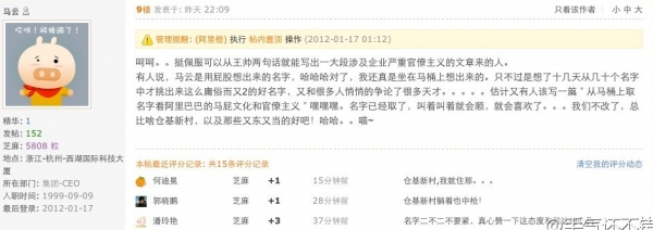 “有人说,马云是用屁股想出来的名字,哈哈哈对了,我还真是坐在马桶上想出来的。只不过是想了十几天从几十个名字中才挑出来这么庸俗而又2的好名 字,又和很多人悄悄的争论了很多天才。。。。。估计又有人该写一篇‘从马桶上取名字看阿里巴巴的马屁文化和官僚主义’嘿嘿嘿。”马云说。