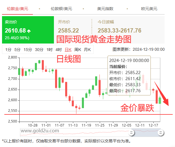 凌晨,美联储如期降息25基点,但同时也降低了2025年降息的强度和幅度,由四次变为两次, 所以,市场理解为美国通胀还是比较缓和,造成了黄金利空大跌,日线图看到最低降到了2583美元/盎司一线。