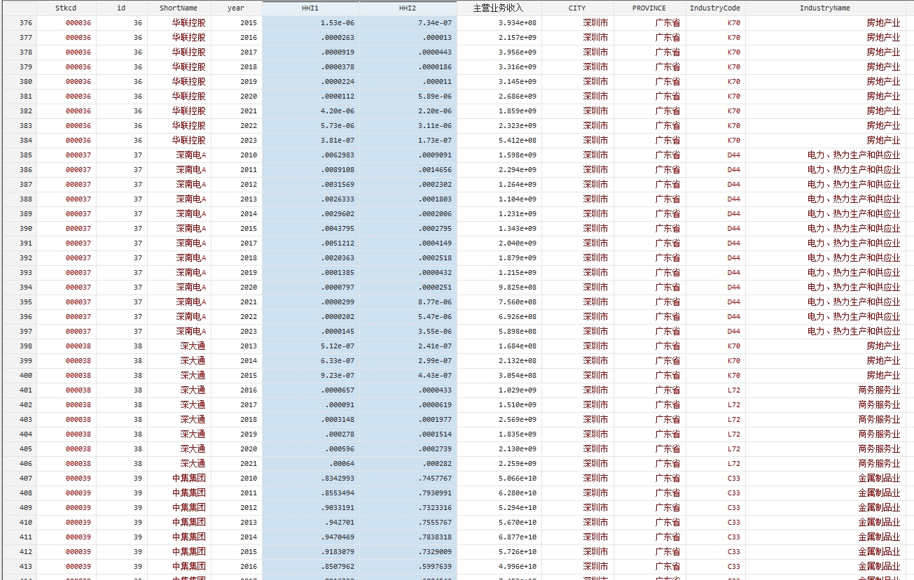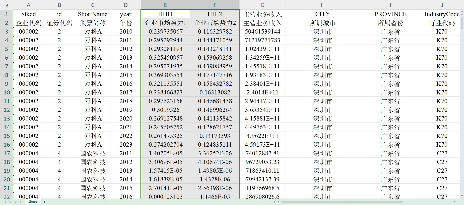 企业市场势力。等于同年同行业同城市各企业主营业务收入计算出的赫芬达尔指数。