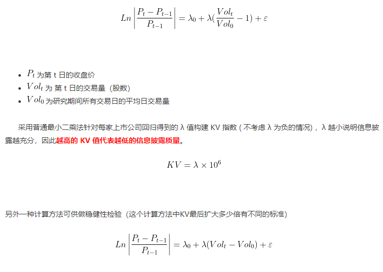 KV 度量法基本原理为: 如果上市公司信息披露质量高,则投资者的股票收益率对其股票交易量依赖性较弱如果上市公司信息披露质量差,则投资者无法借助信息披露对上市公司投资价值进行判断,从而对其股票交易量依赖性较强