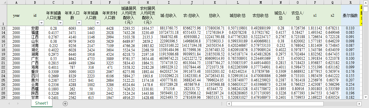 year id 年末城镇人口比重 年末人口数 年末城镇人口数 年末农村人口数 城镇居民人均可支配收入(元) 农村居民人均可支配收入(元) 城-总收入 农-总收入 总收入 城总收/总 农总收/总 城总人/总 农总人/总 x1 x2 泰尔指数