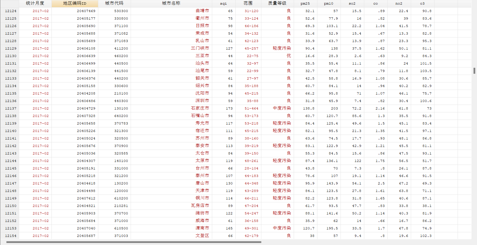 我们收集整理了2013-2024年中国城市空气质量月度数据