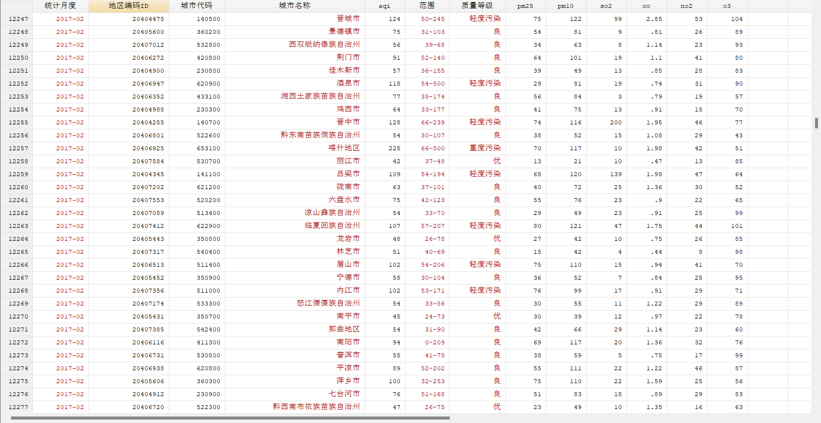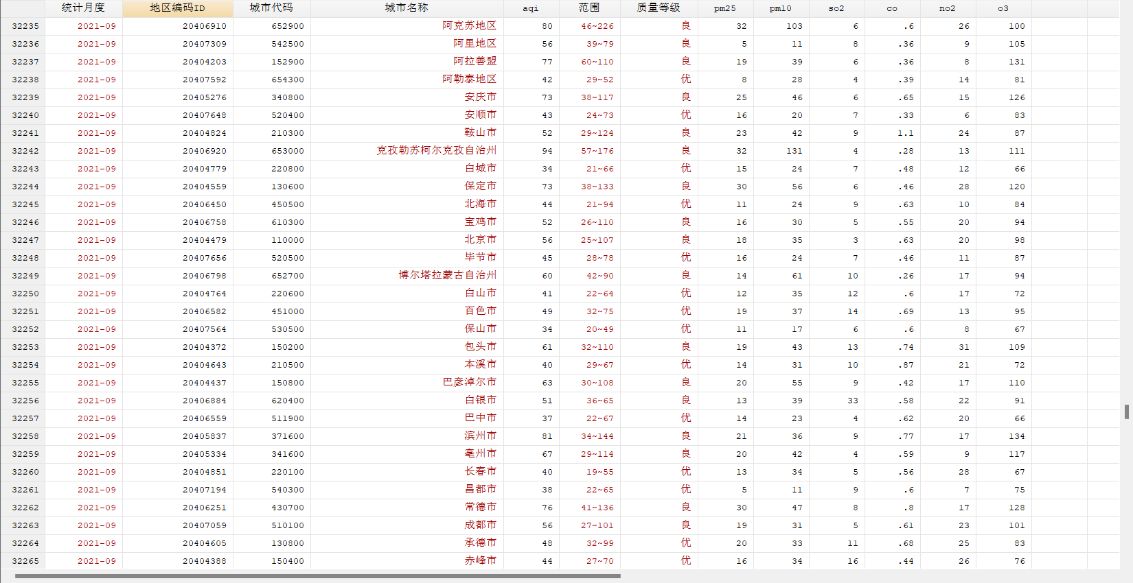统计月度、地区编码ID、城市代码、城市名称