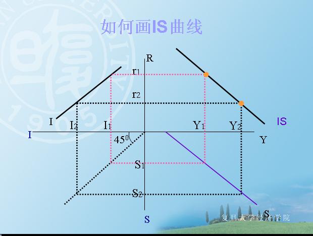 这个是IS曲线的推倒图形,采用的是4象限法,你从第四象限开始瞬时针进行看,你就能明白它是怎么样推出来的了,首先S是Y的函数,然后根据均衡原理I=S,推出I,然后根据I是利率的反函数再推出i,这样就得到IS曲线了.