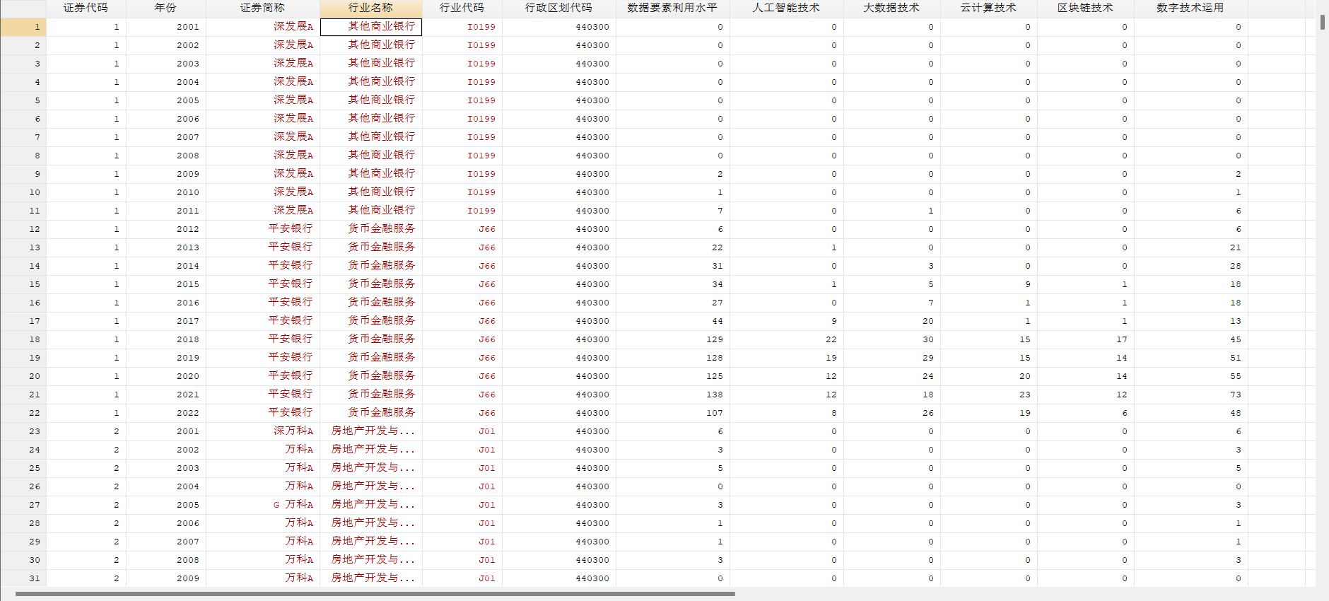 证券代码 年份 证券简称 行业名称 行业代码 行政区划代码 数据要素利用水平 人工智能技术 大数据技术 云计算技术 区块链技术 数字技术运用