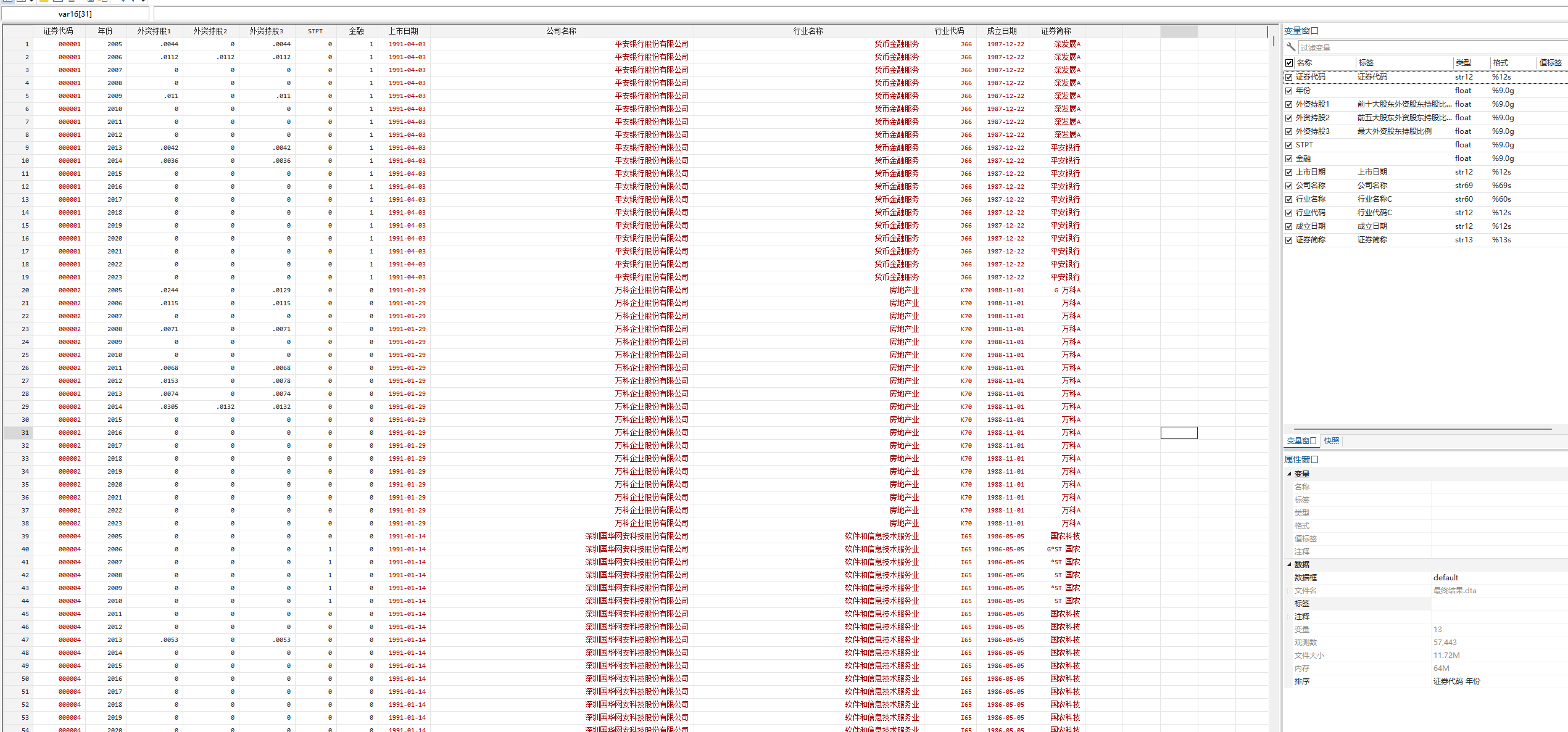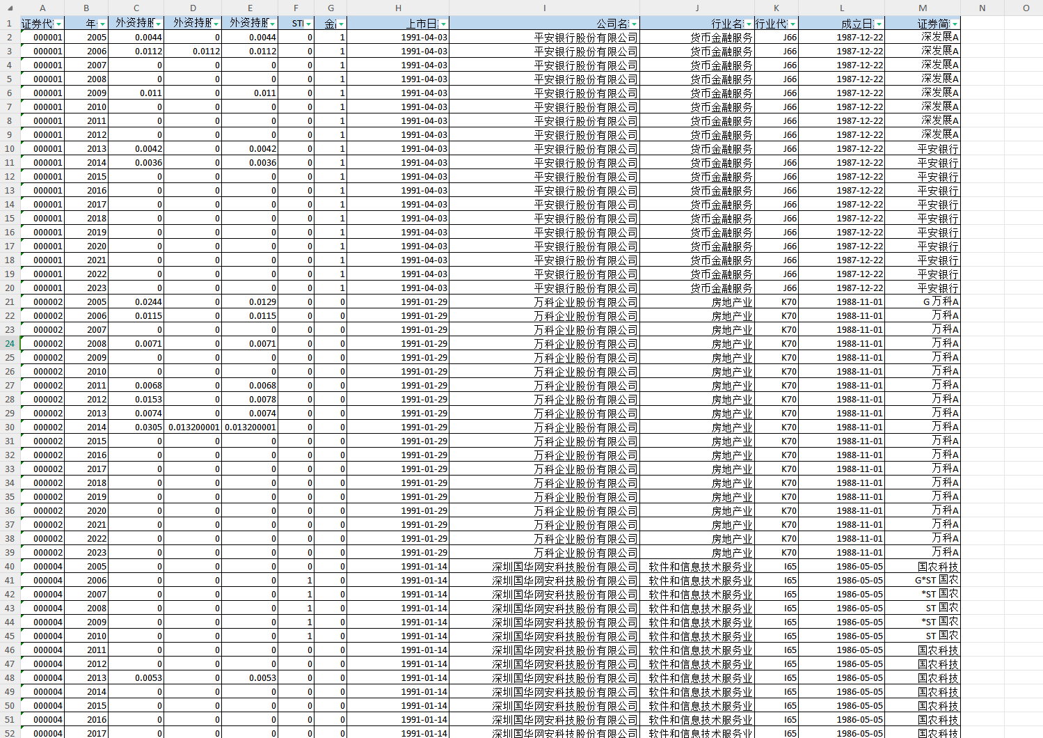 证券代码 年份 外资持股1 外资持股2 外资持股3 STPT 金融 上市日期 公司名称 行业名称 行业代码 成立日期 证券简称
