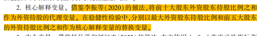 本数据借鉴李振等(2020) 的做法,将前十大股东外资股东持股比例之和作为外资持股的代理变量。 在稳健性检验中,分别以最大外资股东持股比例和前五大股东的外资持股比例之和作为核心解释变量的替换变量。