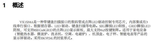 VK1S38A是一种带键盘扫描接口的数码管或点阵LED驱动控 制专用芯片,内部集成有3线串行接口、数据锁存器、LED 驱 动、键盘扫描等电路。SEG脚接LED阳极,GRID脚接LED阴 极,可支持8SEG×8GRID的点阵LED显示面板,最大支持8×3 按键矩阵。适用于家电设备(智能热水器、微波炉、洗衣 机、空调、电磁炉)、机顶盒、电子秤、智能电表等产品的 显示屏驱动。采用SSOP24L的封装形式。LJQ3779