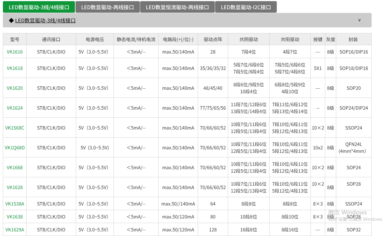 VK1650 3.0~5.5V 驱动点阵:32 共阴驱动:8段4位 共阳驱动:4段8位 通讯接口:CLK/DAT