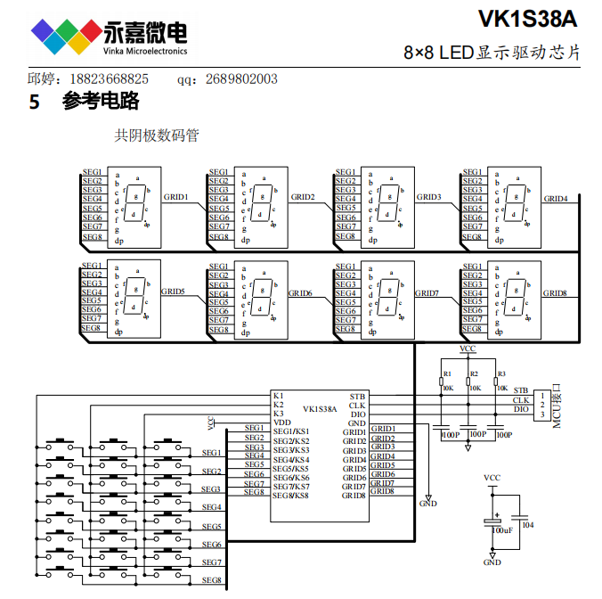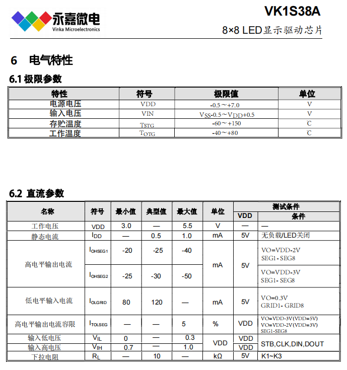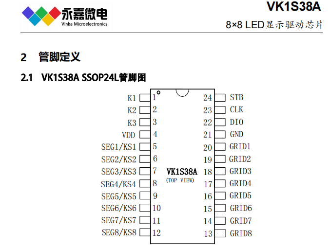 VK1S38A 3.0~5.5V 驱动点阵:64 共阴驱动:8段8位 共阳驱动:8段8位 通讯接口:CLK/STB/DIO