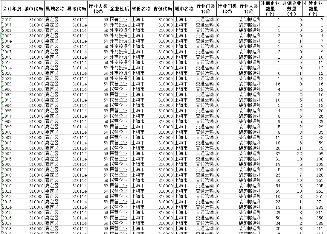 | 会计年度 | 城市代码 | 县域名称 | 县域代码 | 行业大类代码 | 企业性质 | 省份名称 | 省份代码 | 城市名称 | 行业门类名称 | 行业门类代码 | 行业大类名称 | 注册企业数量(个) | 注销企业数量(个) | 存续企业数量(个) |