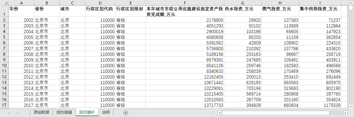 excel数据文件包原始数据(由于多年度指标不同存在缺失值)、线性插值、回归填补三个版本,提供您参考使用。