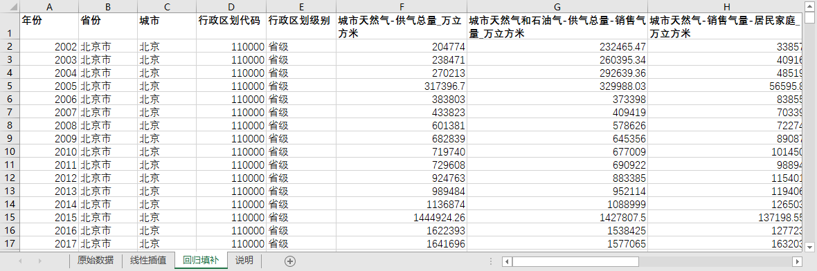 全国680多个地级市县级市2002-2023天然气供气总量居民家庭供热燃气汽车销售气量损失量含原始数据及无缺失值填补含省级汇总