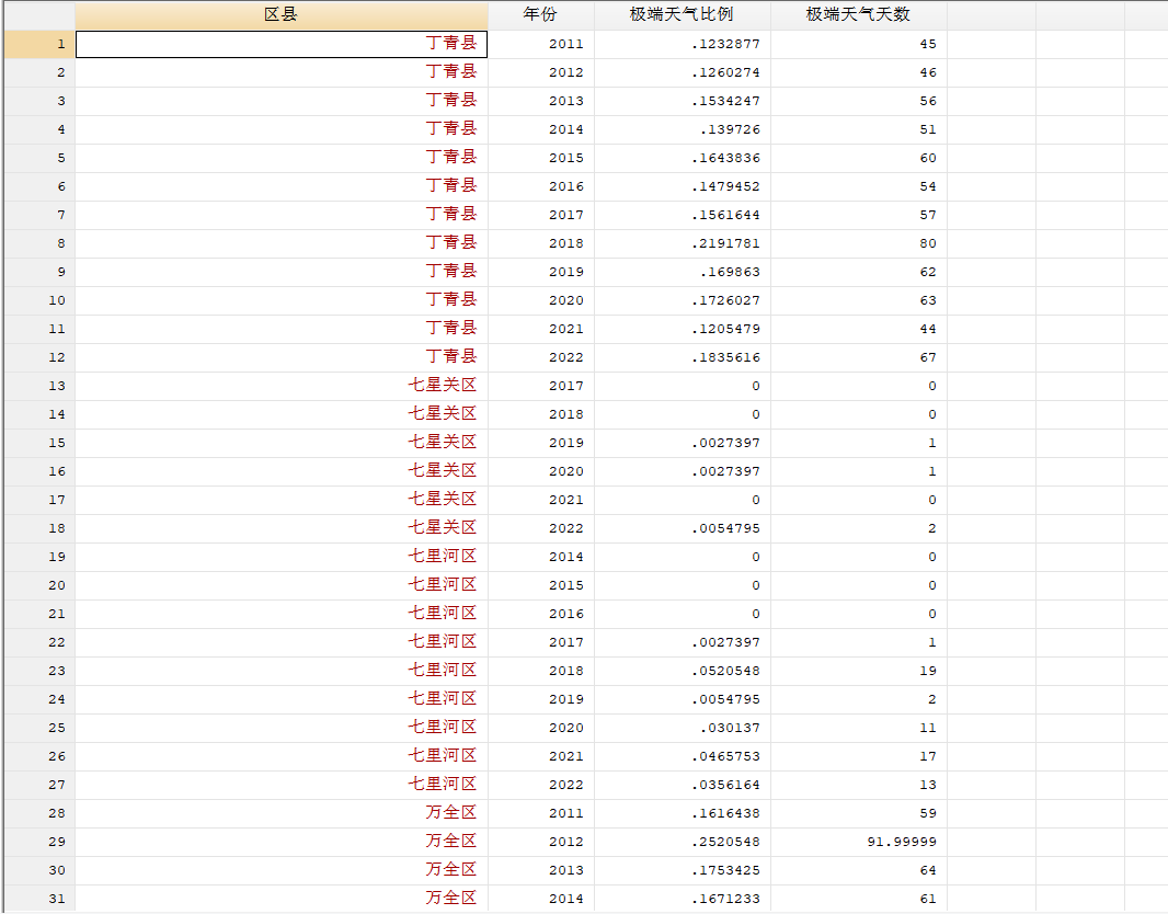 然后,按照地级市和区县分组加总,得到极端天气天数,除以365得到极端天气比例