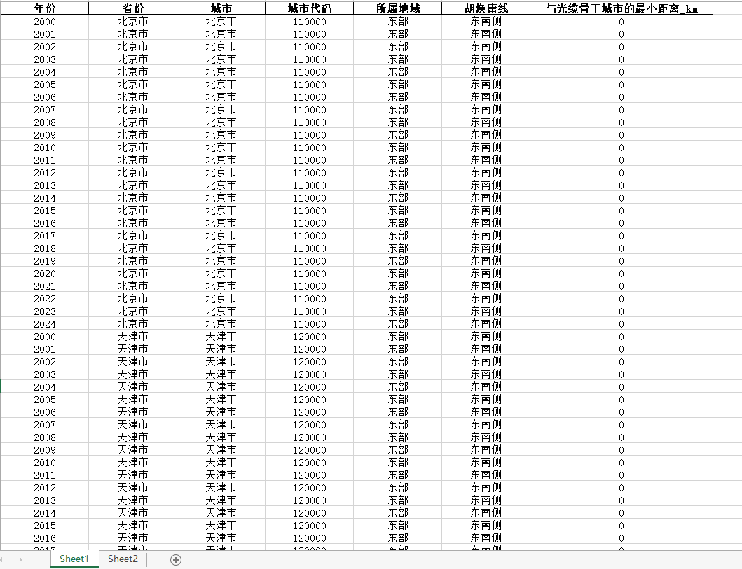 2000-2024年全国298地级市距八横八纵光缆干线核心节点最短距离excel+dta面板数据