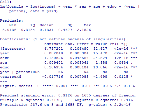 s19880711 发表于 2012-2-12 21:33 迴歸式: log(income)=6.737201+0.082049*year+1.130826*sexM+0.009401*age+0.106934*educ+NA*year|pearso ...