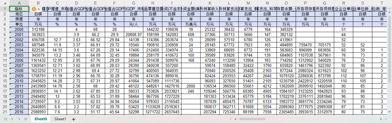GDP GDP增速 第一产业增加值占GDP比重 第二产业增加值占GDP比重 第三产业增加值占GDP比重 人均GDP 社会消费品零售总额 固定资产投资(不含农户) 新设外商投资企业数_外商直接投资 实际利用外资金额(美元) 一般公共预算收入 一般公共预算支出 一般公共预算支出_教育 一般公共预算支出_科学技术 金融机构人民币各项存款余额_个人储蓄存款 金融机构人民币各项存款余额 金融机构人民币各项贷款余额 规模以上工业企业单位数 规模以上工业企业单位数_内资企业 规模以上工业企业单位数_港澳台商投资企业 规模以上工业企业单位数_外商投资企业 规模以上工业总产值 规模以上工业总产值_内资企业 规模以上工业总产值_港澳台商投资企业 规模以上工业总产值_外商投资企业 规模以上工业企业流动资产合计 规模以上工业企业固定资产合计 规模以上工业企业利润总额 规模以上工业企业应交增值税 规模以上工业企业主营业务税金及附加 户籍人口数 年均户籍人口数 户籍人口自然增长率 第一产业就业人员占全部城镇单位就业人员比重 第二产业就业人员占全部城镇单位就业人员比重 第三产业就业人员占全部城镇单位就业人员比重 城镇非私营单位就业人员数 城镇非私营单位就业人员数_第一产业 城镇非私营单位就业人员数_第二产业 城镇非私营单位就业人员数_第三产业 城镇非私营单位就业人员数_农、林、牧、渔业 城镇非私营单位就业人员数_采矿业 城镇非私营单位就业人员数_制造业 城镇非私营单位就业人员数_电力、热力、燃气及水生产和供应业 城镇非私营单位就业人员数_建筑业 城镇非私营单位就业人员数_批发和零售业 城镇非私营单位就业人员数_交通运输、仓储和邮政业 城镇非私营单位就业人员数_住宿和餐饮业 城镇非私营单位就业人员数_信息传输、软件和信息技术服务业 城镇非私营单位就业人员数_金融业 城镇非私营单位就业人员数_房地产业 城镇非私营单位就业人员数_租赁和商务服务业 城镇非私营单位就业人员数_科学研究和技术服务业 城镇非私营单位就业人员数_水利、环境和公共设施管理业 城镇非私营单位就业人员数_居民服务、修理和其他服务业 城镇非私营单位就业人员数_教育 城镇非私营单位就业人员数_卫生和社会工作 城镇非私营单位就业人员数_文化、体育和娱乐业 城镇非私营单位就业人员数_公共管理、社会保障和社会组织 城镇非私营单位在岗职工平均人数 城镇就业人员数_私营企业和个体 城镇非私营单位在岗职工工资总额 城镇非私营单位在岗职工平均工资 城镇登记失业人员数 城市建成区面积 城市建设用地面积 城市建设用地面积_居住用地 城市液化石油气供气总量 城市液化石油气供气总量_居民家庭 城市人工煤气、天然气供气总量 城市人工煤气、天然气供气总量_居民家庭 城市液化石油气用气人口 人工煤气、天然气用气人口 城市公共汽电车运营车辆数 城市出租汽车运营车辆数 城市公共汽电车客运总量 城市道路面积 城市排水管道长度 城市建成区绿化覆盖面积 城市建成区绿化覆盖率 城市绿地面积 城市公园绿地面积 城市维护建设资金支出 土地面积 城市生活用水供水量 城市供水总量 全社会用电量 城乡居民生活用电量 工业生产用电量 房地产开发投资 房地产开发投资_住宅 限额以上批发和零售业法人单位数 限额以上批发和零售业商品销售总额 普通中学学校数 中等职业教育学校数 普通小学学校数 普通高等学校专任教师数 普通中学专任教师数 中等职业教育专任教师数 普通小学专任教师数 ....