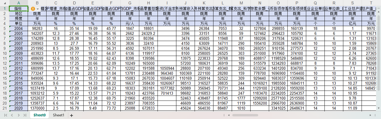 GDP GDP增速 第一产业增加值占GDP比重 第二产业增加值占GDP比重 第三产业增加值占GDP比重 人均GDP 社会消费品零售总额 固定资产投资(不含农户) 新设外商投资企业数_外商直接投资 实际利用外资金额(美元) 一般公共预算收入 一般公共预算支出 一般公共预算支出_教育 一般公共预算支出_科学技术 金融机构人民币各项存款余额_个人储蓄存款 金融机构人民币各项存款余额 金融机构人民币各项贷款余额 规模以上工业企业单位数 规模以上工业企业单位数_内资企业 规模以上工业企业单位数_港澳台商投资企业 规模以上工业企业单位数_外商投资企业 规模以上工业总产值 规模以上工业总产值_内资企业 规模以上工业总产值_港澳台商投资企业 规模以上工业总产值_外商投资企业 规模以上工业企业流动资产合计 规模以上工业企业固定资产合计 规模以上工业企业利润总额 规模以上工业企业应交增值税 规模以上工业企业主营业务税金及附加 户籍人口数 年均户籍人口数 户籍人口自然增长率 第一产业就业人员占全部城镇单位就业人员比重 第二产业就业人员占全部城镇单位就业人员比重 第三产业就业人员占全部城镇单位就业人员比重 城镇非私营单位就业人员数 城镇非私营单位就业人员数_第一产业 城镇非私营单位就业人员数_第二产业 城镇非私营单位就业人员数_第三产业 城镇非私营单位就业人员数_农、林、牧、渔业 城镇非私营单位就业人员数_采矿业 城镇非私营单位就业人员数_制造业 城镇非私营单位就业人员数_电力、热力、燃气及水生产和供应业 城镇非私营单位就业人员数_建筑业 城镇非私营单位就业人员数_批发和零售业 城镇非私营单位就业人员数_交通运输、仓储和邮政业 城镇非私营单位就业人员数_住宿和餐饮业 城镇非私营单位就业人员数_信息传输、软件和信息技术服务业 城镇非私营单位就业人员数_金融业 城镇非私营单位就业人员数_房地产业 城镇非私营单位就业人员数_租赁和商务服务业 城镇非私营单位就业人员数_科学研究和技术服务业 城镇非私营单位就业人员数_水利、环境和公共设施管理业 城镇非私营单位就业人员数_居民服务、修理和其他服务业 城镇非私营单位就业人员数_教育 城镇非私营单位就业人员数_卫生和社会工作 城镇非私营单位就业人员数_文化、体育和娱乐业 城镇非私营单位就业人员数_公共管理、社会保障和社会组织 城镇非私营单位在岗职工平均人数 城镇就业人员数_私营企业和个体 城镇非私营单位在岗职工工资总额 城镇非私营单位在岗职工平均工资 城镇登记失业人员数 城市建成区面积 城市建设用地面积 城市建设用地面积_居住用地 城市液化石油气供气总量 城市液化石油气供气总量_居民家庭 城市人工煤气、天然气供气总量 城市人工煤气、天然气供气总量_居民家庭 城市液化石油气用气人口 人工煤气、天然气用气人口 城市公共汽电车运营车辆数 城市出租汽车运营车辆数 城市公共汽电车客运总量 城市道路面积 城市排水管道长度 城市建成区绿化覆盖面积 城市建成区绿化覆盖率 城市绿地面积 城市公园绿地面积 城市维护建设资金支出 土地面积 城市生活用水供水量 城市供水总量 全社会用电量 城乡居民生活用电量 工业生产用电量 房地产开发投资 房地产开发投资_住宅 限额以上批发和零售业法人单位数 限额以上批发和零售业商品销售总额 普通中学学校数 中等职业教育学校数 普通小学学校数 普通高等学校专任教师数 普通中学专任教师数 中等职业教育专任教师数 普通小学专任教师数 ....