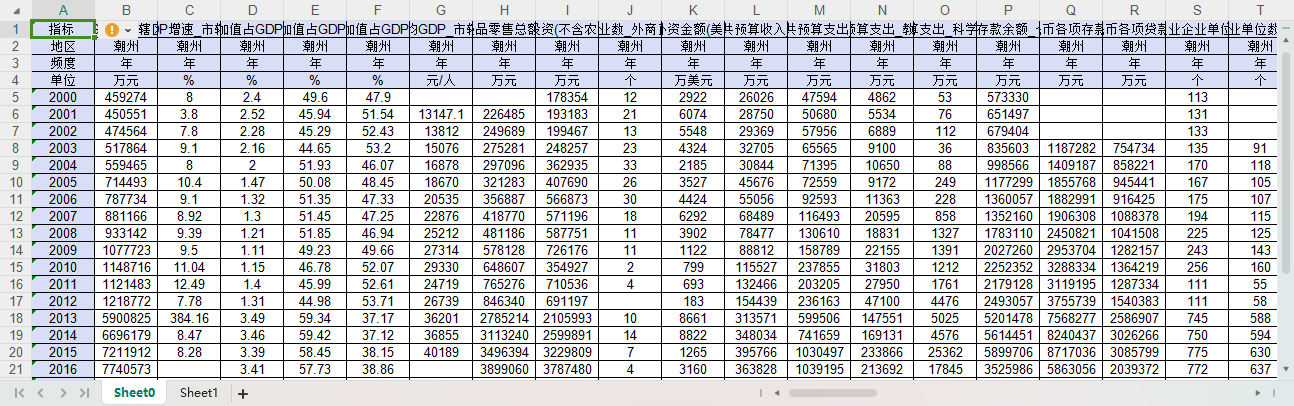 GDP GDP增速 第一产业增加值占GDP比重 第二产业增加值占GDP比重 第三产业增加值占GDP比重 人均GDP 社会消费品零售总额 固定资产投资(不含农户) 新设外商投资企业数_外商直接投资 实际利用外资金额(美元) 一般公共预算收入 一般公共预算支出 一般公共预算支出_教育 一般公共预算支出_科学技术 金融机构人民币各项存款余额_个人储蓄存款 金融机构人民币各项存款余额 金融机构人民币各项贷款余额 规模以上工业企业单位数 规模以上工业企业单位数_内资企业 规模以上工业企业单位数_港澳台商投资企业 规模以上工业企业单位数_外商投资企业 规模以上工业总产值 规模以上工业总产值_内资企业 规模以上工业总产值_港澳台商投资企业 规模以上工业总产值_外商投资企业 规模以上工业企业流动资产合计 规模以上工业企业固定资产合计 规模以上工业企业利润总额 规模以上工业企业应交增值税 规模以上工业企业主营业务税金及附加 户籍人口数 年均户籍人口数 户籍人口自然增长率 第一产业就业人员占全部城镇单位就业人员比重 第二产业就业人员占全部城镇单位就业人员比重 第三产业就业人员占全部城镇单位就业人员比重 城镇非私营单位就业人员数 城镇非私营单位就业人员数_第一产业 城镇非私营单位就业人员数_第二产业 城镇非私营单位就业人员数_第三产业 城镇非私营单位就业人员数_农、林、牧、渔业 城镇非私营单位就业人员数_采矿业 城镇非私营单位就业人员数_制造业 城镇非私营单位就业人员数_电力、热力、燃气及水生产和供应业 城镇非私营单位就业人员数_建筑业 城镇非私营单位就业人员数_批发和零售业 城镇非私营单位就业人员数_交通运输、仓储和邮政业 城镇非私营单位就业人员数_住宿和餐饮业 城镇非私营单位就业人员数_信息传输、软件和信息技术服务业 城镇非私营单位就业人员数_金融业 城镇非私营单位就业人员数_房地产业 城镇非私营单位就业人员数_租赁和商务服务业 城镇非私营单位就业人员数_科学研究和技术服务业 城镇非私营单位就业人员数_水利、环境和公共设施管理业 城镇非私营单位就业人员数_居民服务、修理和其他服务业 城镇非私营单位就业人员数_教育 城镇非私营单位就业人员数_卫生和社会工作 城镇非私营单位就业人员数_文化、体育和娱乐业 城镇非私营单位就业人员数_公共管理、社会保障和社会组织 城镇非私营单位在岗职工平均人数 城镇就业人员数_私营企业和个体 城镇非私营单位在岗职工工资总额 城镇非私营单位在岗职工平均工资 城镇登记失业人员数 城市建成区面积 城市建设用地面积 城市建设用地面积_居住用地 城市液化石油气供气总量 城市液化石油气供气总量_居民家庭 城市人工煤气、天然气供气总量 城市人工煤气、天然气供气总量_居民家庭 城市液化石油气用气人口 人工煤气、天然气用气人口 城市公共汽电车运营车辆数 城市出租汽车运营车辆数 城市公共汽电车客运总量 城市道路面积 城市排水管道长度 城市建成区绿化覆盖面积 城市建成区绿化覆盖率 城市绿地面积 城市公园绿地面积 城市维护建设资金支出 土地面积 城市生活用水供水量 城市供水总量 全社会用电量 城乡居民生活用电量 工业生产用电量 房地产开发投资 房地产开发投资_住宅 限额以上批发和零售业法人单位数 限额以上批发和零售业商品销售总额 普通中学学校数 中等职业教育学校数 普通小学学校数 普通高等学校专任教师数 普通中学专任教师数 中等职业教育专任教师数 普通小学专任教师数 ....