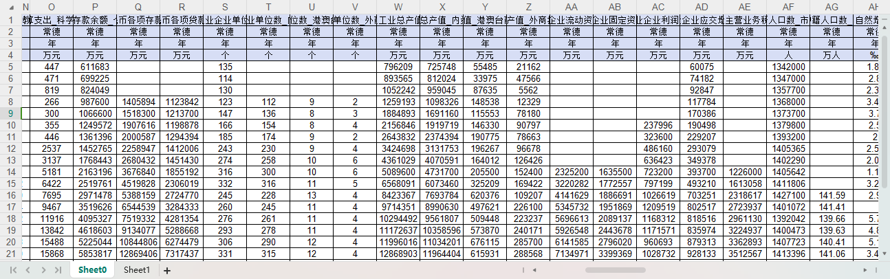 GDP GDP增速 第一产业增加值占GDP比重 第二产业增加值占GDP比重 第三产业增加值占GDP比重 人均GDP 社会消费品零售总额 固定资产投资(不含农户) 新设外商投资企业数_外商直接投资 实际利用外资金额(美元) 一般公共预算收入 一般公共预算支出 一般公共预算支出_教育 一般公共预算支出_科学技术 金融机构人民币各项存款余额_个人储蓄存款 金融机构人民币各项存款余额 金融机构人民币各项贷款余额 规模以上工业企业单位数 规模以上工业企业单位数_内资企业 规模以上工业企业单位数_港澳台商投资企业 规模以上工业企业单位数_外商投资企业 规模以上工业总产值 规模以上工业总产值_内资企业 规模以上工业总产值_港澳台商投资企业 规模以上工业总产值_外商投资企业 规模以上工业企业流动资产合计 规模以上工业企业固定资产合计 规模以上工业企业利润总额 规模以上工业企业应交增值税 规模以上工业企业主营业务税金及附加 户籍人口数 年均户籍人口数 户籍人口自然增长率 第一产业就业人员占全部城镇单位就业人员比重 第二产业就业人员占全部城镇单位就业人员比重 第三产业就业人员占全部城镇单位就业人员比重 城镇非私营单位就业人员数 城镇非私营单位就业人员数_第一产业 城镇非私营单位就业人员数_第二产业 城镇非私营单位就业人员数_第三产业 城镇非私营单位就业人员数_农、林、牧、渔业 城镇非私营单位就业人员数_采矿业 城镇非私营单位就业人员数_制造业 城镇非私营单位就业人员数_电力、热力、燃气及水生产和供应业 城镇非私营单位就业人员数_建筑业 城镇非私营单位就业人员数_批发和零售业 城镇非私营单位就业人员数_交通运输、仓储和邮政业 城镇非私营单位就业人员数_住宿和餐饮业 城镇非私营单位就业人员数_信息传输、软件和信息技术服务业 城镇非私营单位就业人员数_金融业 城镇非私营单位就业人员数_房地产业 城镇非私营单位就业人员数_租赁和商务服务业 城镇非私营单位就业人员数_科学研究和技术服务业 城镇非私营单位就业人员数_水利、环境和公共设施管理业 城镇非私营单位就业人员数_居民服务、修理和其他服务业 城镇非私营单位就业人员数_教育 城镇非私营单位就业人员数_卫生和社会工作 城镇非私营单位就业人员数_文化、体育和娱乐业 城镇非私营单位就业人员数_公共管理、社会保障和社会组织 城镇非私营单位在岗职工平均人数 城镇就业人员数_私营企业和个体 城镇非私营单位在岗职工工资总额 城镇非私营单位在岗职工平均工资 城镇登记失业人员数 城市建成区面积 城市建设用地面积 城市建设用地面积_居住用地 城市液化石油气供气总量 城市液化石油气供气总量_居民家庭 城市人工煤气、天然气供气总量 城市人工煤气、天然气供气总量_居民家庭 城市液化石油气用气人口 人工煤气、天然气用气人口 城市公共汽电车运营车辆数 城市出租汽车运营车辆数 城市公共汽电车客运总量 城市道路面积 城市排水管道长度 城市建成区绿化覆盖面积 城市建成区绿化覆盖率 城市绿地面积 城市公园绿地面积 城市维护建设资金支出 土地面积 城市生活用水供水量 城市供水总量 全社会用电量 城乡居民生活用电量 工业生产用电量 房地产开发投资 房地产开发投资_住宅 限额以上批发和零售业法人单位数 限额以上批发和零售业商品销售总额 普通中学学校数 中等职业教育学校数 普通小学学校数 普通高等学校专任教师数 普通中学专任教师数 中等职业教育专任教师数 普通小学专任教师数 ....