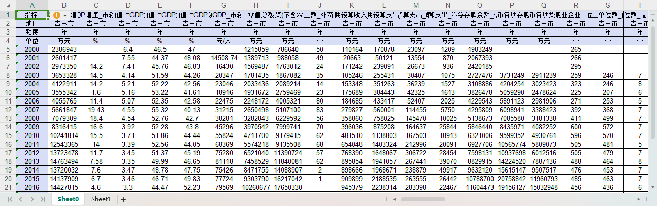 GDP GDP增速 第一产业增加值占GDP比重 第二产业增加值占GDP比重 第三产业增加值占GDP比重 人均GDP 社会消费品零售总额 固定资产投资(不含农户) 新设外商投资企业数_外商直接投资 实际利用外资金额(美元) 一般公共预算收入 一般公共预算支出 一般公共预算支出_教育 一般公共预算支出_科学技术 金融机构人民币各项存款余额_个人储蓄存款 金融机构人民币各项存款余额 金融机构人民币各项贷款余额 规模以上工业企业单位数 规模以上工业企业单位数_内资企业 规模以上工业企业单位数_港澳台商投资企业 规模以上工业企业单位数_外商投资企业 规模以上工业总产值 规模以上工业总产值_内资企业 规模以上工业总产值_港澳台商投资企业 规模以上工业总产值_外商投资企业 规模以上工业企业流动资产合计 规模以上工业企业固定资产合计 规模以上工业企业利润总额 规模以上工业企业应交增值税 规模以上工业企业主营业务税金及附加 户籍人口数 年均户籍人口数 户籍人口自然增长率 第一产业就业人员占全部城镇单位就业人员比重 第二产业就业人员占全部城镇单位就业人员比重 第三产业就业人员占全部城镇单位就业人员比重 城镇非私营单位就业人员数 城镇非私营单位就业人员数_第一产业 城镇非私营单位就业人员数_第二产业 城镇非私营单位就业人员数_第三产业 城镇非私营单位就业人员数_农、林、牧、渔业 城镇非私营单位就业人员数_采矿业 城镇非私营单位就业人员数_制造业 城镇非私营单位就业人员数_电力、热力、燃气及水生产和供应业 城镇非私营单位就业人员数_建筑业 城镇非私营单位就业人员数_批发和零售业 城镇非私营单位就业人员数_交通运输、仓储和邮政业 城镇非私营单位就业人员数_住宿和餐饮业 城镇非私营单位就业人员数_信息传输、软件和信息技术服务业 城镇非私营单位就业人员数_金融业 城镇非私营单位就业人员数_房地产业 城镇非私营单位就业人员数_租赁和商务服务业 城镇非私营单位就业人员数_科学研究和技术服务业 城镇非私营单位就业人员数_水利、环境和公共设施管理业 城镇非私营单位就业人员数_居民服务、修理和其他服务业 城镇非私营单位就业人员数_教育 城镇非私营单位就业人员数_卫生和社会工作 城镇非私营单位就业人员数_文化、体育和娱乐业 城镇非私营单位就业人员数_公共管理、社会保障和社会组织 城镇非私营单位在岗职工平均人数 城镇就业人员数_私营企业和个体 城镇非私营单位在岗职工工资总额 城镇非私营单位在岗职工平均工资 城镇登记失业人员数 城市建成区面积 城市建设用地面积 城市建设用地面积_居住用地 城市液化石油气供气总量 城市液化石油气供气总量_居民家庭 城市人工煤气、天然气供气总量 城市人工煤气、天然气供气总量_居民家庭 城市液化石油气用气人口 人工煤气、天然气用气人口 城市公共汽电车运营车辆数 城市出租汽车运营车辆数 城市公共汽电车客运总量 城市道路面积 城市排水管道长度 城市建成区绿化覆盖面积 城市建成区绿化覆盖率 城市绿地面积 城市公园绿地面积 城市维护建设资金支出 土地面积 城市生活用水供水量 城市供水总量 全社会用电量 城乡居民生活用电量 工业生产用电量 房地产开发投资 房地产开发投资_住宅 限额以上批发和零售业法人单位数 限额以上批发和零售业商品销售总额 普通中学学校数 中等职业教育学校数 普通小学学校数 普通高等学校专任教师数 普通中学专任教师数 中等职业教育专任教师数 普通小学专任教师数 ....