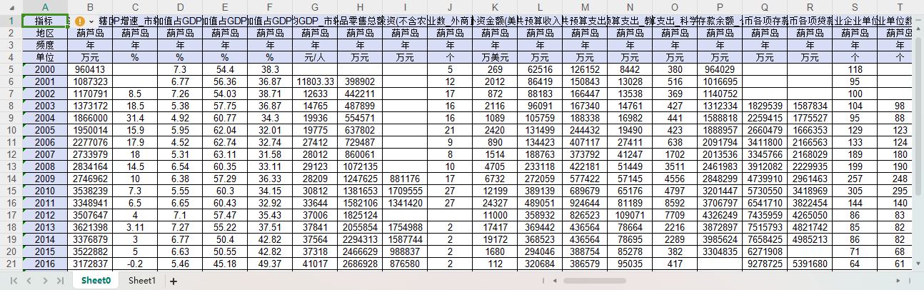 GDP GDP增速 第一产业增加值占GDP比重 第二产业增加值占GDP比重 第三产业增加值占GDP比重 人均GDP 社会消费品零售总额 固定资产投资(不含农户) 新设外商投资企业数_外商直接投资 实际利用外资金额(美元) 一般公共预算收入 一般公共预算支出 一般公共预算支出_教育 一般公共预算支出_科学技术 金融机构人民币各项存款余额_个人储蓄存款 金融机构人民币各项存款余额 金融机构人民币各项贷款余额 规模以上工业企业单位数 规模以上工业企业单位数_内资企业 规模以上工业企业单位数_港澳台商投资企业 规模以上工业企业单位数_外商投资企业 规模以上工业总产值 规模以上工业总产值_内资企业 规模以上工业总产值_港澳台商投资企业 规模以上工业总产值_外商投资企业 规模以上工业企业流动资产合计 规模以上工业企业固定资产合计 规模以上工业企业利润总额 规模以上工业企业应交增值税 规模以上工业企业主营业务税金及附加 户籍人口数 年均户籍人口数 户籍人口自然增长率 第一产业就业人员占全部城镇单位就业人员比重 第二产业就业人员占全部城镇单位就业人员比重 第三产业就业人员占全部城镇单位就业人员比重 城镇非私营单位就业人员数 城镇非私营单位就业人员数_第一产业 城镇非私营单位就业人员数_第二产业 城镇非私营单位就业人员数_第三产业 城镇非私营单位就业人员数_农、林、牧、渔业 城镇非私营单位就业人员数_采矿业 城镇非私营单位就业人员数_制造业 城镇非私营单位就业人员数_电力、热力、燃气及水生产和供应业 城镇非私营单位就业人员数_建筑业 城镇非私营单位就业人员数_批发和零售业 城镇非私营单位就业人员数_交通运输、仓储和邮政业 城镇非私营单位就业人员数_住宿和餐饮业 城镇非私营单位就业人员数_信息传输、软件和信息技术服务业 城镇非私营单位就业人员数_金融业 城镇非私营单位就业人员数_房地产业 城镇非私营单位就业人员数_租赁和商务服务业 城镇非私营单位就业人员数_科学研究和技术服务业 城镇非私营单位就业人员数_水利、环境和公共设施管理业 城镇非私营单位就业人员数_居民服务、修理和其他服务业 城镇非私营单位就业人员数_教育 城镇非私营单位就业人员数_卫生和社会工作 城镇非私营单位就业人员数_文化、体育和娱乐业 城镇非私营单位就业人员数_公共管理、社会保障和社会组织 城镇非私营单位在岗职工平均人数 城镇就业人员数_私营企业和个体 城镇非私营单位在岗职工工资总额 城镇非私营单位在岗职工平均工资 城镇登记失业人员数 城市建成区面积 城市建设用地面积 城市建设用地面积_居住用地 城市液化石油气供气总量 城市液化石油气供气总量_居民家庭 城市人工煤气、天然气供气总量 城市人工煤气、天然气供气总量_居民家庭 城市液化石油气用气人口 人工煤气、天然气用气人口 城市公共汽电车运营车辆数 城市出租汽车运营车辆数 城市公共汽电车客运总量 城市道路面积 城市排水管道长度 城市建成区绿化覆盖面积 城市建成区绿化覆盖率 城市绿地面积 城市公园绿地面积 城市维护建设资金支出 土地面积 城市生活用水供水量 城市供水总量 全社会用电量 城乡居民生活用电量 工业生产用电量 房地产开发投资 房地产开发投资_住宅 限额以上批发和零售业法人单位数 限额以上批发和零售业商品销售总额 普通中学学校数 中等职业教育学校数 普通小学学校数 普通高等学校专任教师数 普通中学专任教师数 中等职业教育专任教师数 普通小学专任教师数 ....
