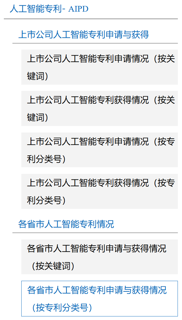 人工智能专利研究数据库(AIPD )结合国家知识产权局专利数据和相关文献研究,基于机器学习方法生成的人工智能词典,通过检索专利的标题和摘要文本中是否涉及人工智能关键词,来识别公司和地区当年申请或获得与人工智能技术相关的专利。此外,人工智能专利研究还统计了分类号符合国家知识产权局 2023 年 9 月发布的《关键数字技术专利分类体系(2023)》标准的人工智能技术专利数据。AIPD 分为两个模块:各省市人工智能专利情况和上市公司人工智能专利申请与获得。AIPD 不仅统计了发明、实用新型和外观设计三种类别专利的历年申请及授权情况,其中还区分了诸如专利独立申请还是联合申请等重要信息,方便学者在人工智能领域进行深度研究。