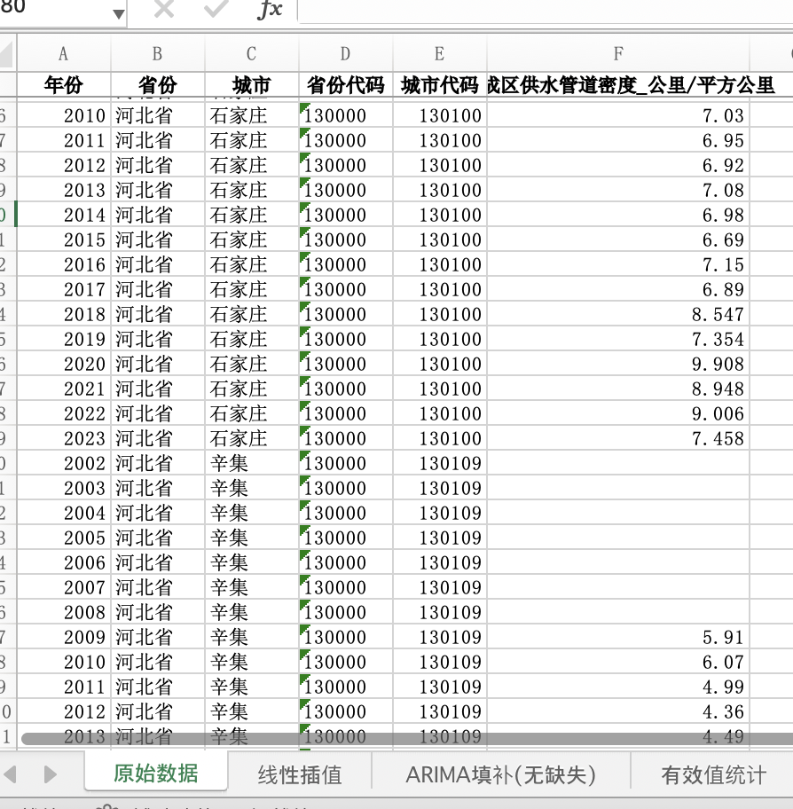 · 数据格式:Excel数据文件包含原始数据(由于多年度指标不同存在缺失值)、线性插值、ARIMA填补(无缺失)三个版本,提供您参考使用。其中,ARIMA填补无缺失值。