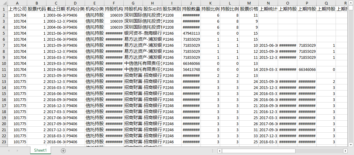 上市公司ID 股票代码 截止日期 机构分类编码 机构分类 持股机构ID 持股机构 股东ID对应的基金ID 股东类别编码 持股数量 持股比例相对总股本 持股比例相对流通A股 股票价格 上期统计截止日期 上期持股机构ID 上期持股数量 上期持股比例相对总股本 上期持股比例相对流通A股 上期股票价格 期间送转增配股比例 增减维持标识 行业代码 行业名称 数据来源 行业代码1 行业名称1 证券代码c 统计年度