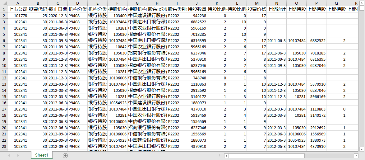 上市公司ID 股票代码 截止日期 机构分类编码 机构分类 持股机构ID 持股机构 股东ID对应的基金ID 股东类别编码 持股数量 持股比例相对总股本 持股比例相对流通A股 股票价格 上期统计截止日期 上期持股机构ID 上期持股数量 上期持股比例相对总股本 上期持股比例相对流通A股 上期股票价格 期间送转增配股比例 增减维持标识 行业代码 行业名称 数据来源 行业代码1 行业名称1 证券代码c 统计年度