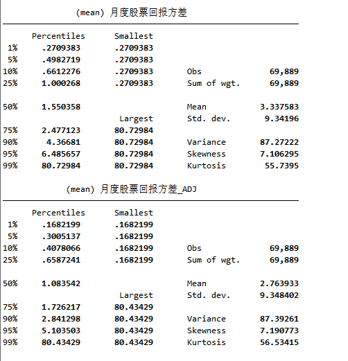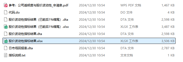 - 两个版本:股价波动性指标结果、股价波动性指标结果(已前后1%缩尾)所以当进行剔除等操作使得样本改变时需要进行重新计算,本资料已按全样本与剔除样本分别进行了计算,可以直接使用)
