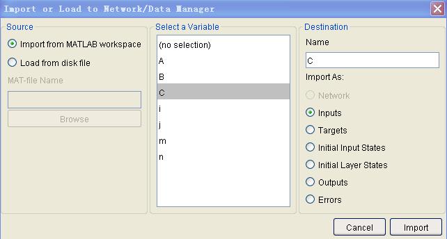 2. 点击Import按钮两次,分别把输入向量和目标输出加入到对应的窗口([Inputs]和[Targets])中,有两种可供选择的加入对象(点击Import后可以看见),一种是把当前工作区中的某个矩阵加入,另一种是通过.mat文件读入;