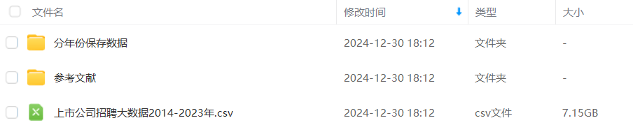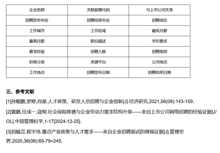 参考《经济研究》中孙鲲鹏(2021)、《管理世界》刘毓芸(2024)等人的做法,从各大网络招聘平台整理了企业的网络招聘数据,并根据上市公司及集团公司的名单,整理上市公司的招聘大数据2014-2023年。总计693万余条,是非常有价值的研究资料