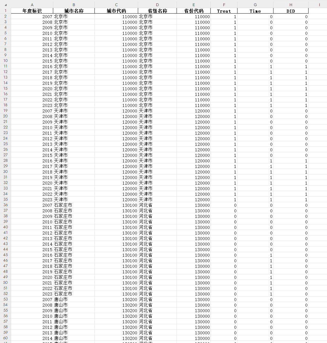 6.完善消费促进机制,提升城市消费竞争力,制定并完善相关政策以推动消费增长。参考Yongbo Sun和Fengqin Wang(2024)的做法,不单只采用国务院2021年批准的率先国际消费中心城市培育建设名单中的上海市、北京市、广州市、天津市、重庆市,为了辨析出潜在的未来试点城市,也参考了全球化与世界城市研究网络(GaWC)出版的《世界城市名册》排名中的内地地级市名单,并基于排序和监视这些城市在2011到2021年间外国消费指标的,从中遴选出 23座对照组城市,它们与上述五座城市组成研究中的“试点城市”,而其余地级市则被纳入了控制组。因此,使用该“试点城市”名单的政策虚拟变量(Treat×Post)表征,若样本城市为试点城市,则赋值为 1,否则为 0;Post为年份虚拟变量,在数据中为Time,需要注意的是,因为国务院首次在2016年出台了“国际消费中心城市“的概念,并且多座城市紧随政策,在当年发起建设国际消费中心相关的项目,所以以2016年为政策影响时间点,Time在2016年及之后取 1,否则为 0。