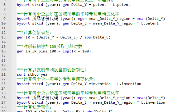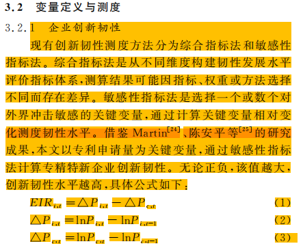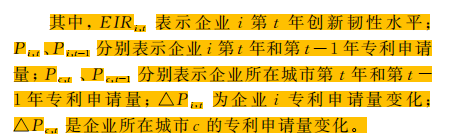 参考C刊《科技进步与对策》王俐(2024)老师的做法,,本文以专利申请量为关键变量,通过敏感性指标法计算企业创新韧性。无论正负,该值越大,创新韧性水平越高,具体公式如下图所示。我们做了创新韧性1和创新韧性2,分别用专利总量和发明专利总量去衡量,大家可以做核心变量或者稳健性检验
